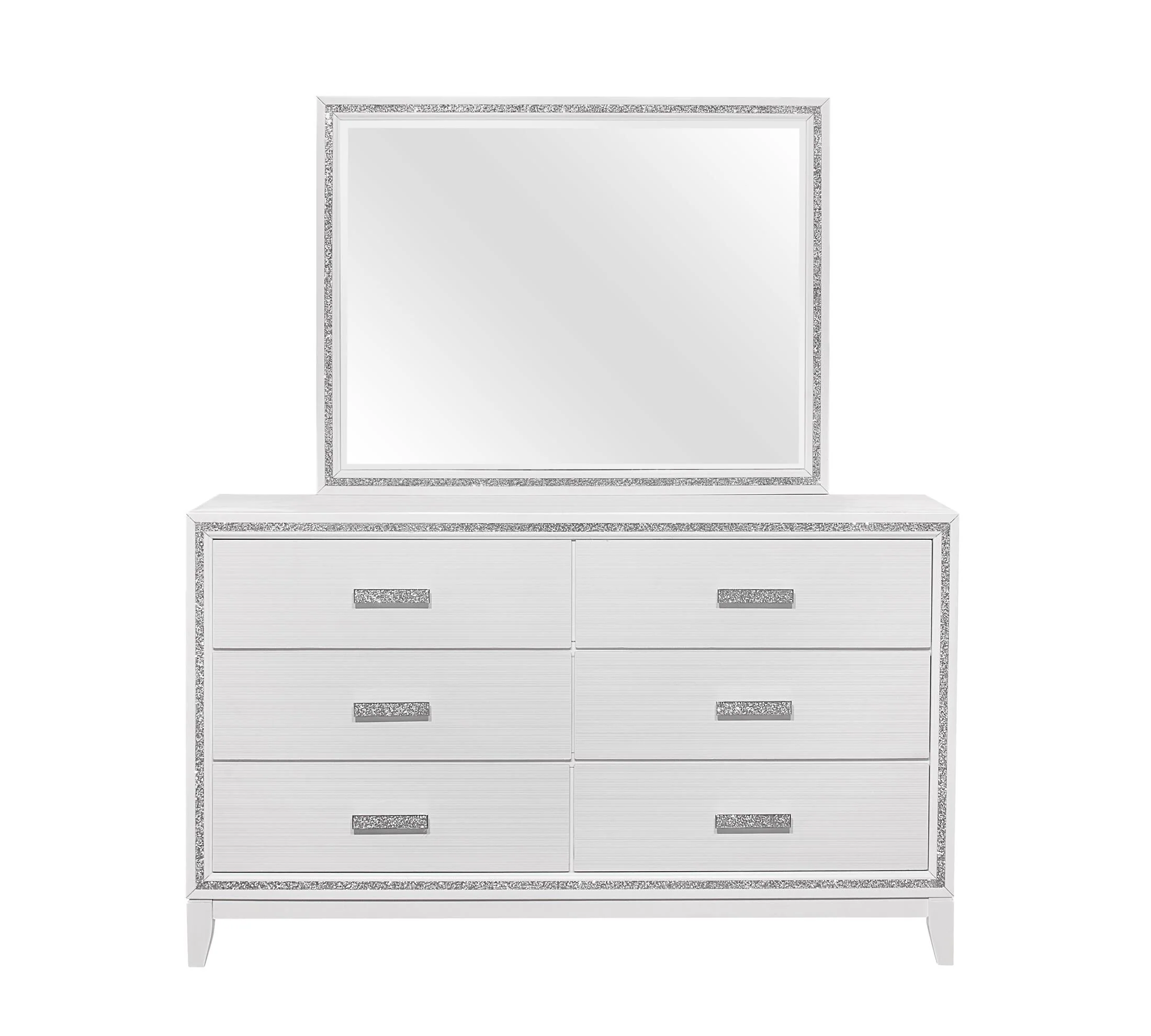 The Alya bedroom brings two worlds together. The classic lines and modern accents create a beautiful transitional glam bedroom look. The crushed crystal-like look outlines all the pieces along with LED lighting accenting the headboard. The crushed crystal-like design is not only used as on accent trim but is also carried over to the hardware. The end result is a beautiful glad look.