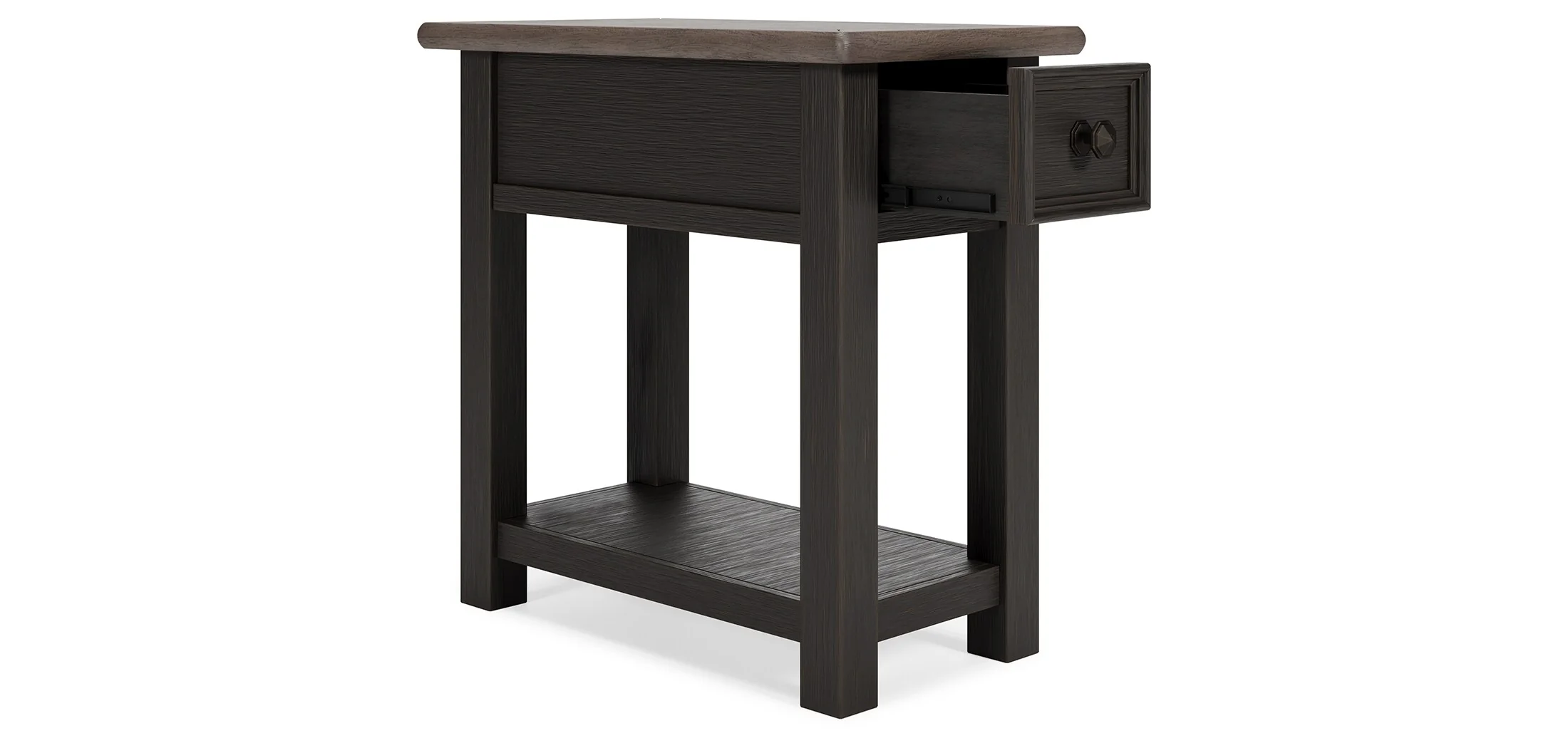 Quality crafted and richly styled, this rectangular chairside end table is sure to charm. Two-tone aesthetic pairs a weathered grayish brown tabletop with a textured wire brushed base in black with rub-through effect. Built-in shelf offers handy display space. Integrated 110V power supply with dual USB charging ports makes it so easy to your personal devices powered up.